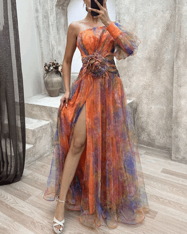 - Style: One shoulder sleeves, pleated floral print, fitted long robe vestidos.