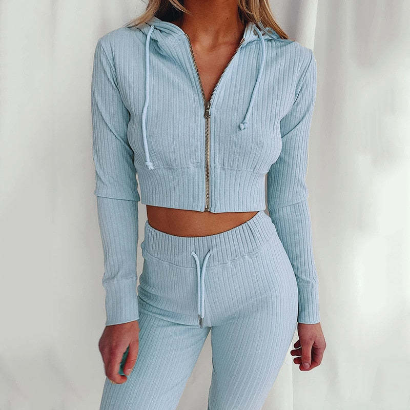 This set features a cropped hooded top and skinny bottoms for a stylish and comfortable look. The pant closure uses a drawstring for the perfect fit, while the top has a zipper closure for convenience. Perfect for a day of lounging or running errands, this set is both comfy and chic.