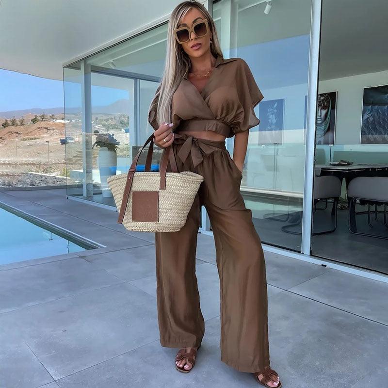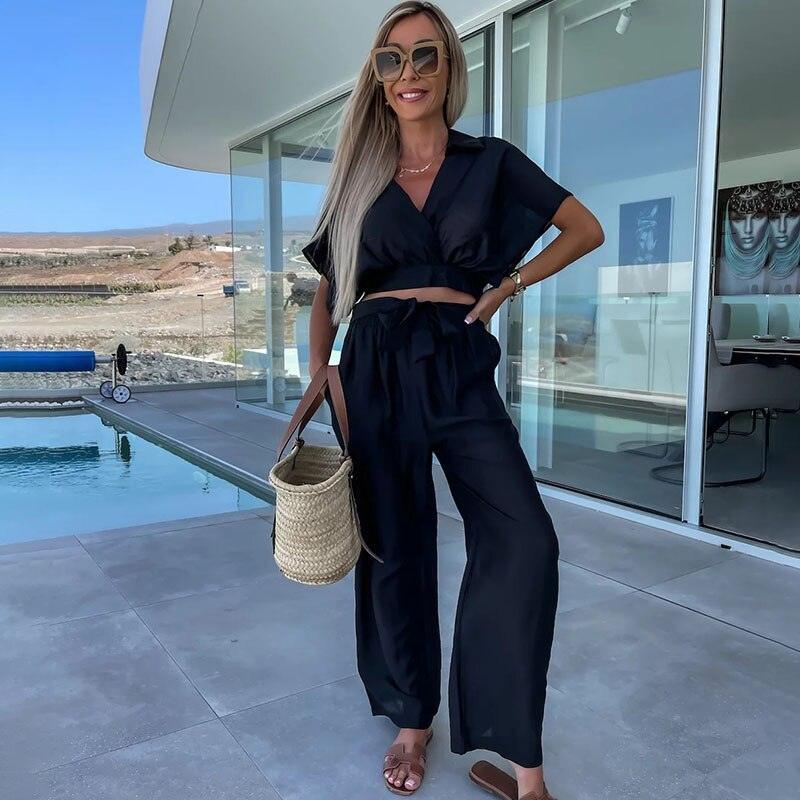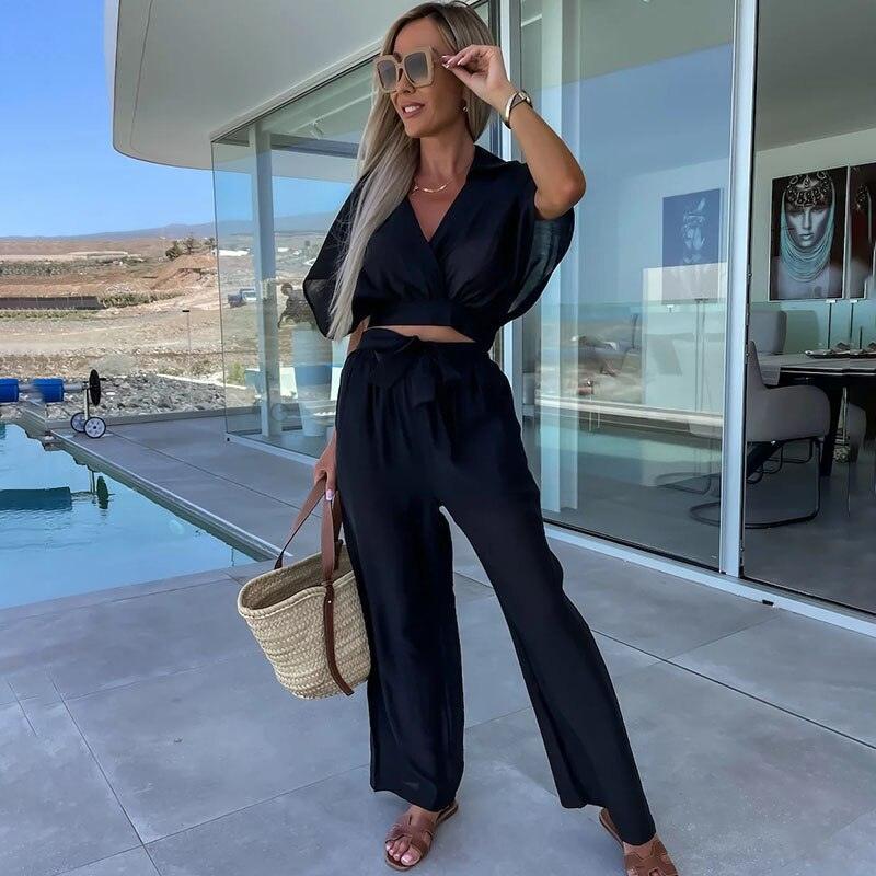 The set consists of a top and trousers. The top has a V-neckline and short sleeves. The trousers have a straight fit and a high waist. The set is perfect for wearing to a party, a gala, or any other festive occasion.
