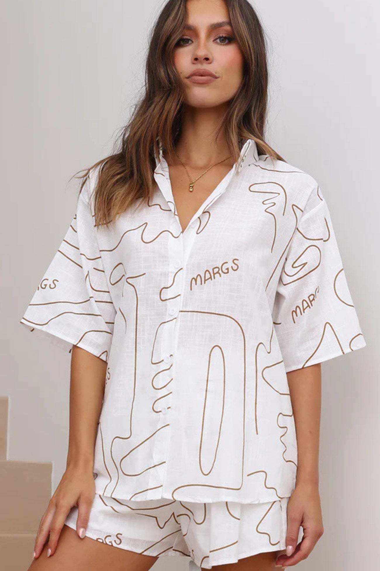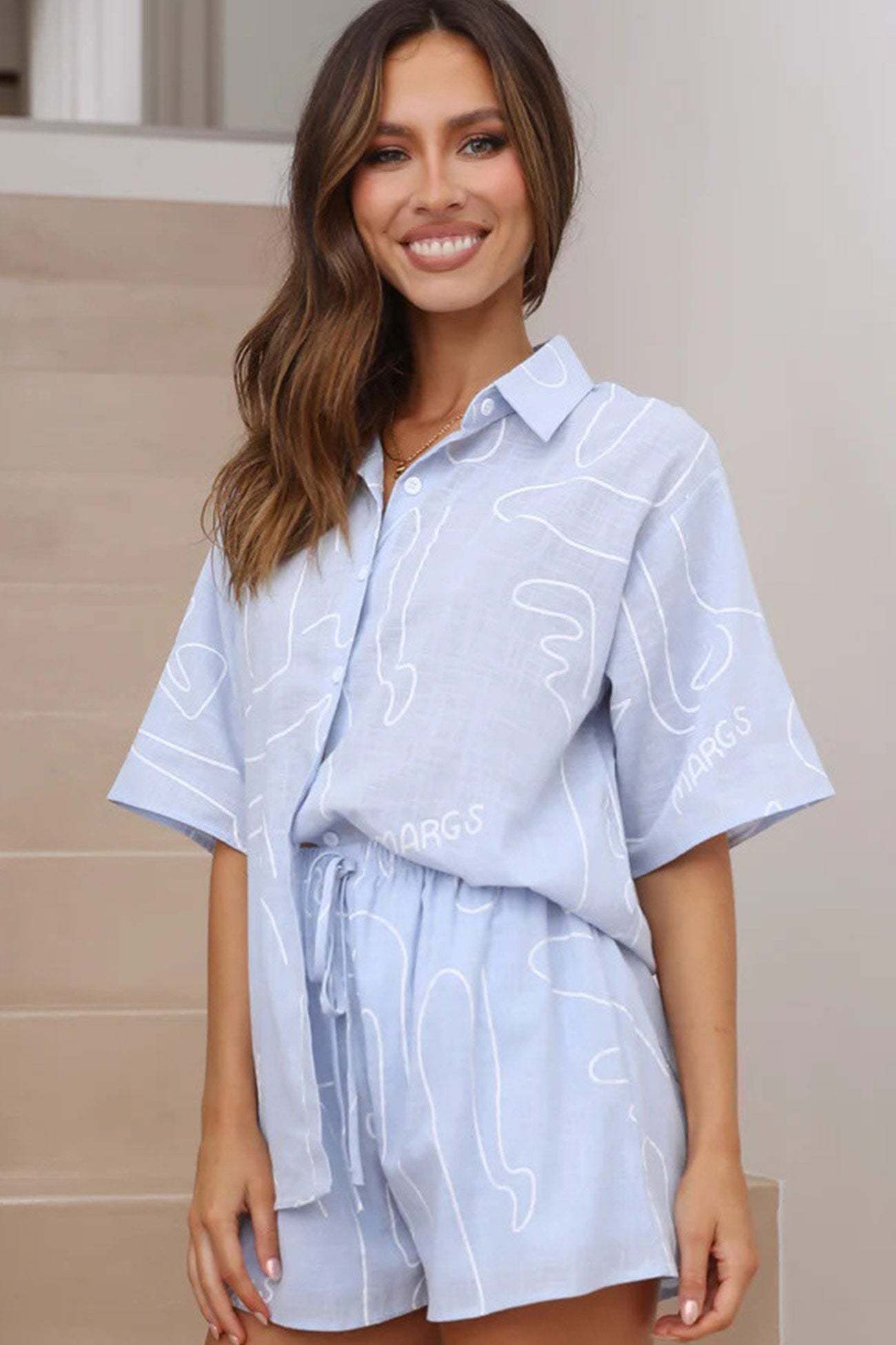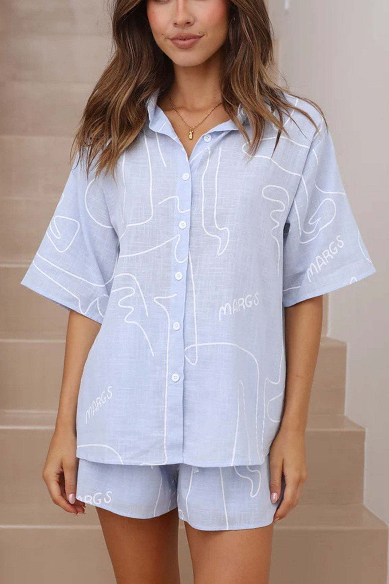 Make a statement with the Penelope Abstract Line Print Shirt Two-Piece Shorts Set. Featuring a unique abstract line print and a matching shirt and shorts combo, this set is perfect for casual outings, summer adventures, or a stylish day out. Embrace artistic flair and modern fashion with this standout ensemble.