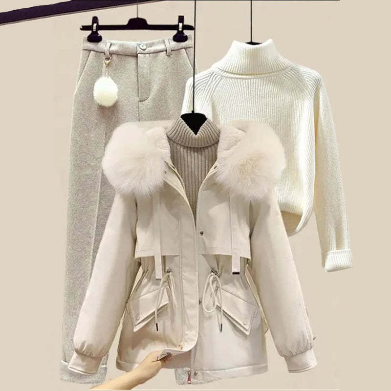 Introducing our Shelia - Soft Snuggle Set – your go-to ensemble for staying cozy and chic during chilly days. This set features a turtleneck knitted sweater, a hooded fur jacket, and harem pants, offering both style and warmth in one complete outfit.